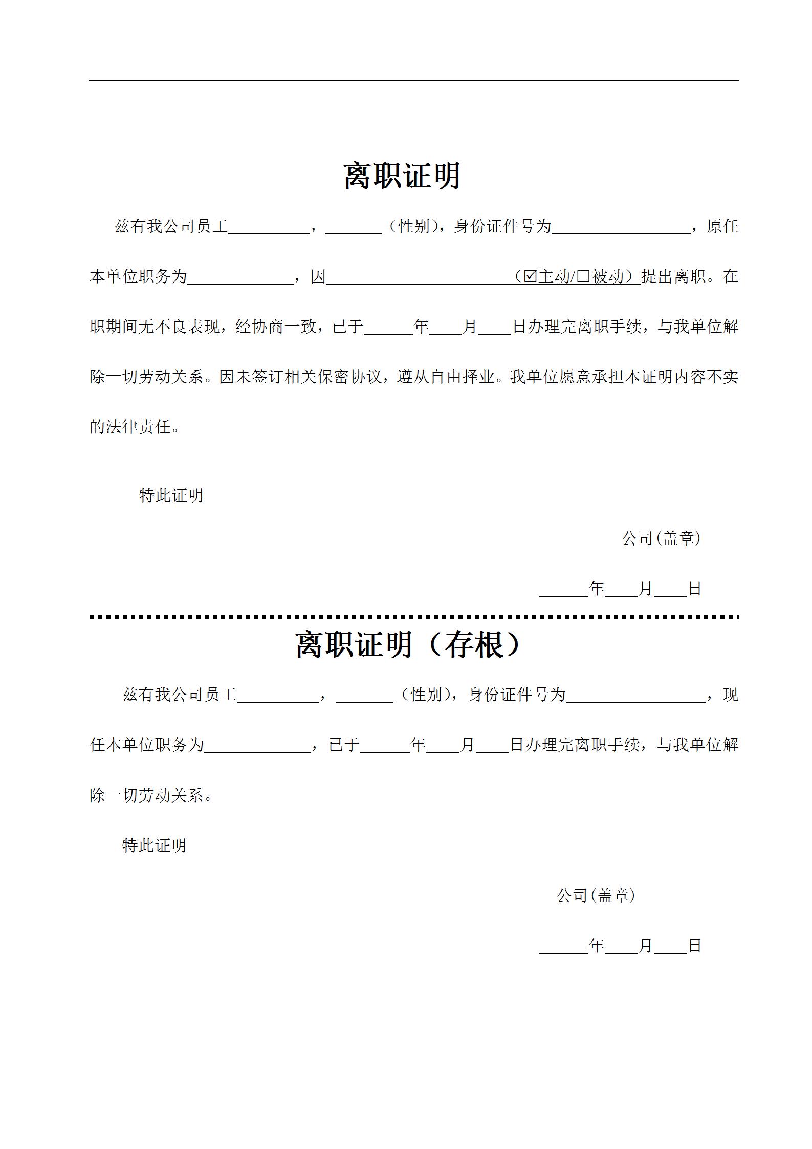 兹有我公司员工 , (性别),身份证件号为 ,原任本单位职务为 ,因 (R主动/□被动)提出离职。