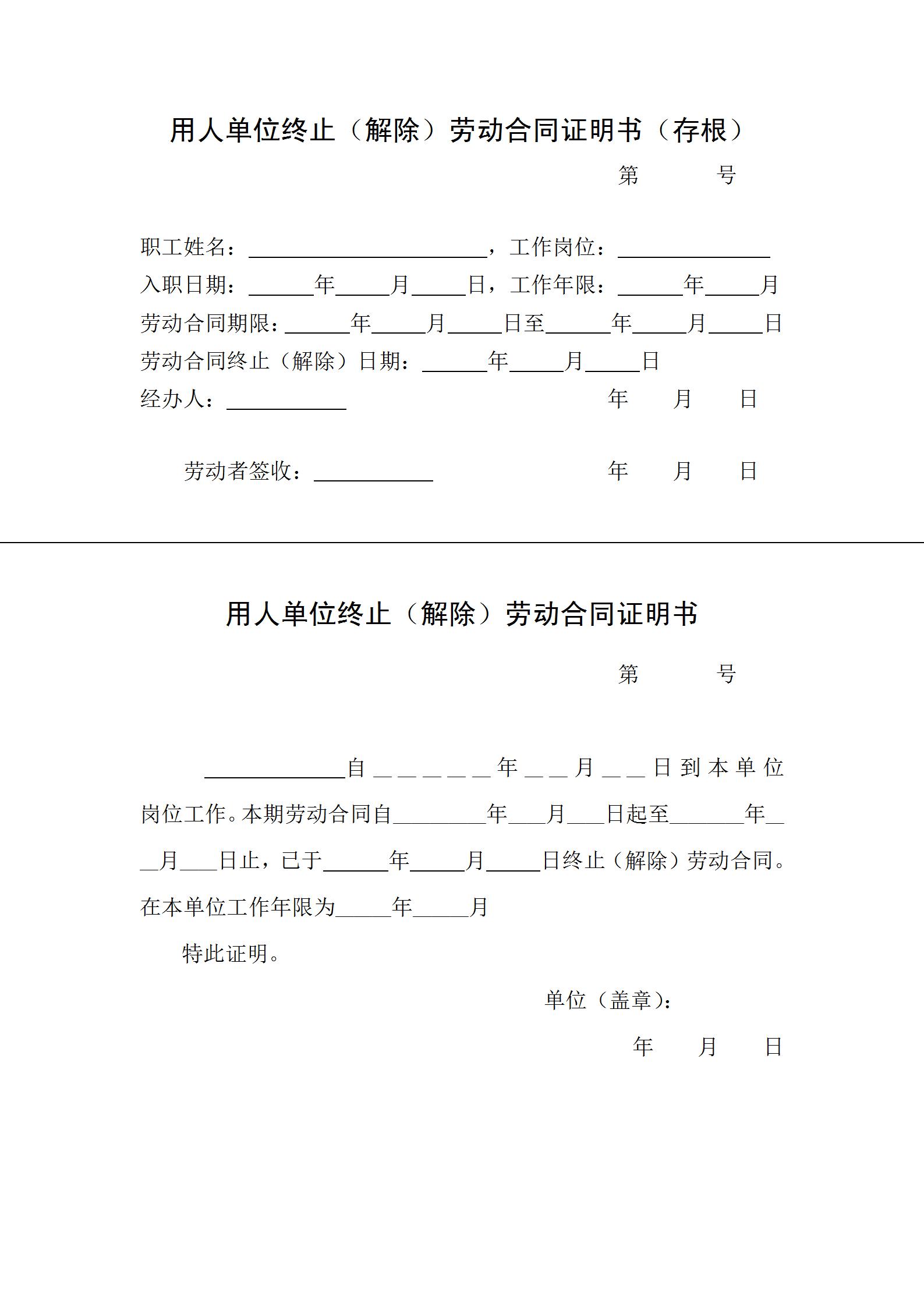 职工姓名: ,工作岗位: 入职日期: 年 月 日,工作年限: 年 月 劳动合同期限: 年 月 日至 年 月 日 劳动合同终止(解除)日期: 年 月 日 经办人: 年 月 日 劳动者签收: 年 月 日